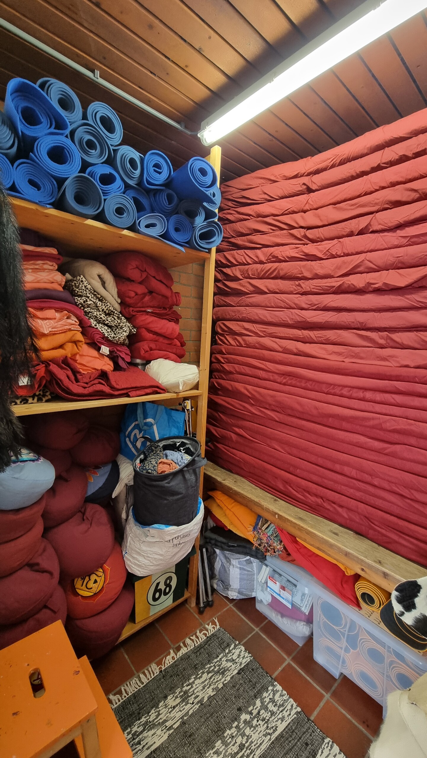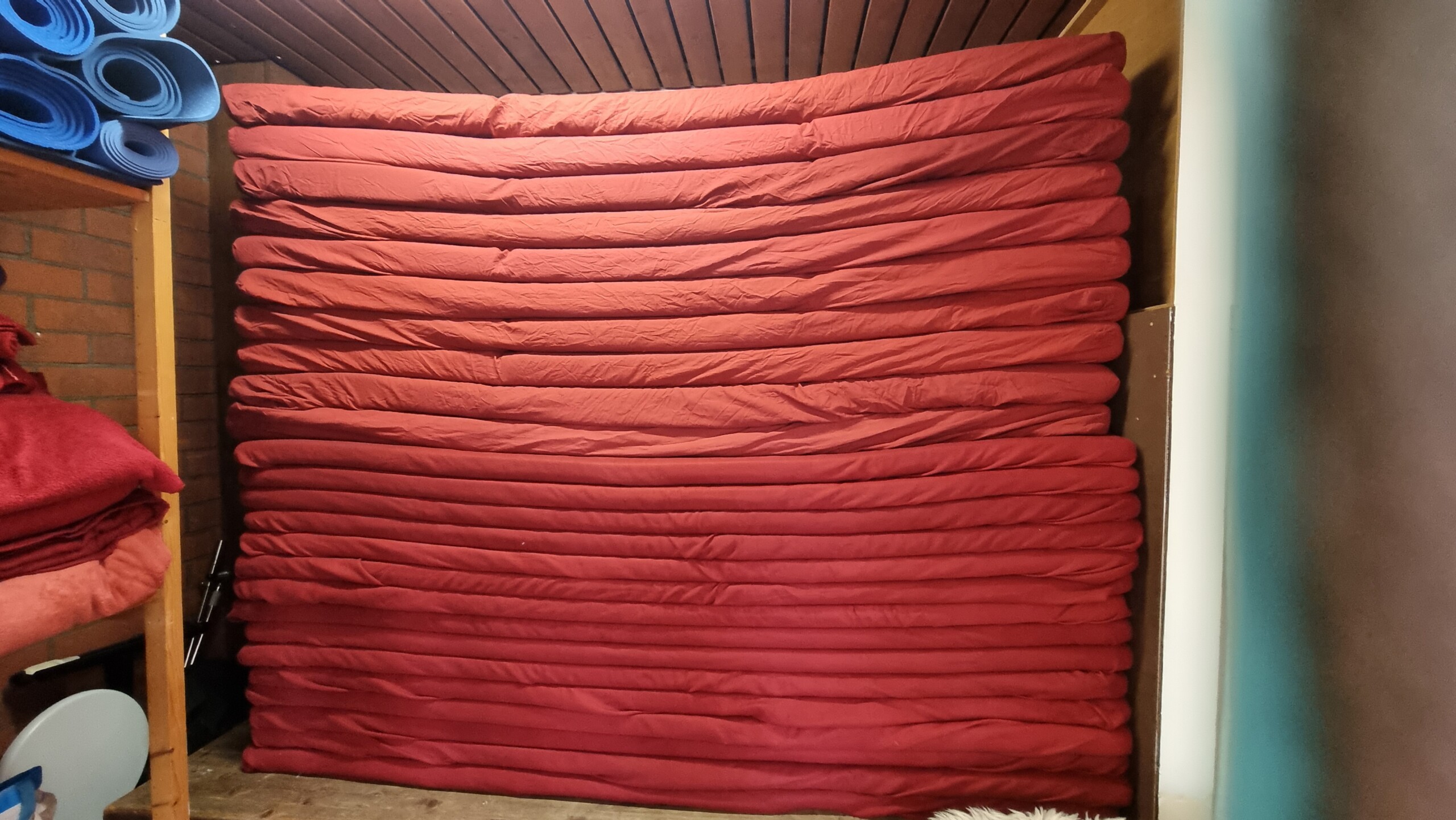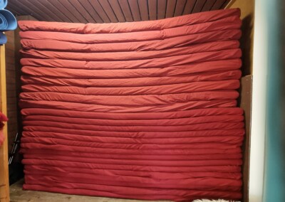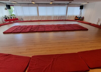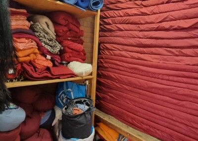 Bags and personal items can be stored in the adjacent, separate cloakroom to keep the main hall tidy and organized. Our staff-only storage area is reserved for workshop essentials such as mats, cushions, and mattresses, ensuring everything is easily accessible for your event.